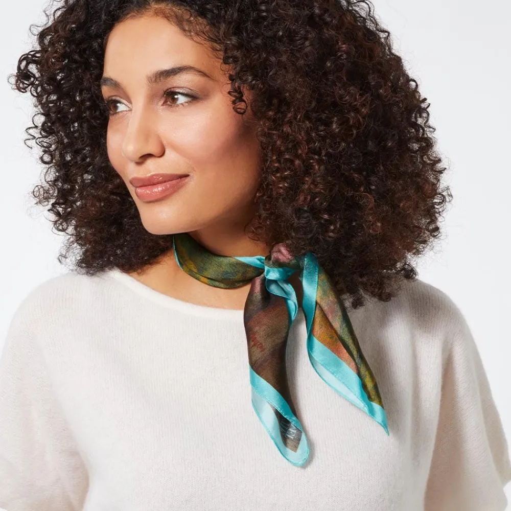 Lend an artful touch to any look with this stylish silk neckerchief featuring Dancers, Pink and Green (ca. 1890) by Edgar Degas (French, 1834–1917). This vivid oil painting in The Met collection affords a privileged view of dancers waiting in the wings of the famed Paris Opéra during a performance. The painting’s heavily impastoed surface suggests that Degas worked directly and extensively on this picture; the artist created an opaque quality by mixing his colors with white and applying the pigments in multiple thick layers, recalling the pastel technique that he perfected in the previous decade.