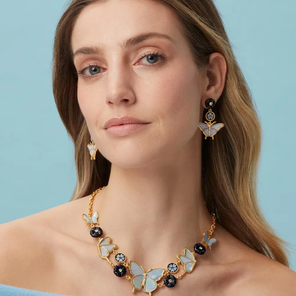 This statement-making necklace is inspired by the mother-of-pearl butterflies decorating a marvelous Japanese box (second half of the 19th century) in The Met’s holdings. Likely reserved for ceremonial tea utensils, the Museum’s Meiji-period treasure—bequeathed by the visionary collector, silversmith, and Tiffany & Co. designer Edward C. Moore (American, 1827–1891)—boasts magnificent craftwork and serves as the most significant example of a Japanese lacquer technique known as maki-e (meaning “sprinkled picture”) in Moore’s expansive collection. Butterflies are beloved subjects in Japanese art, not only for their poetic beauty but for their association with longevity and springtime.